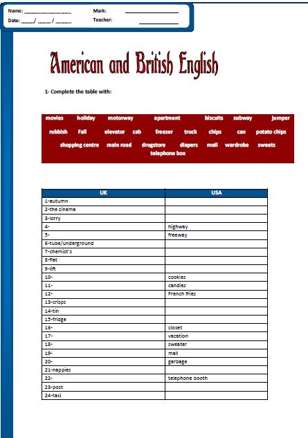 British Vs American English Worksheets