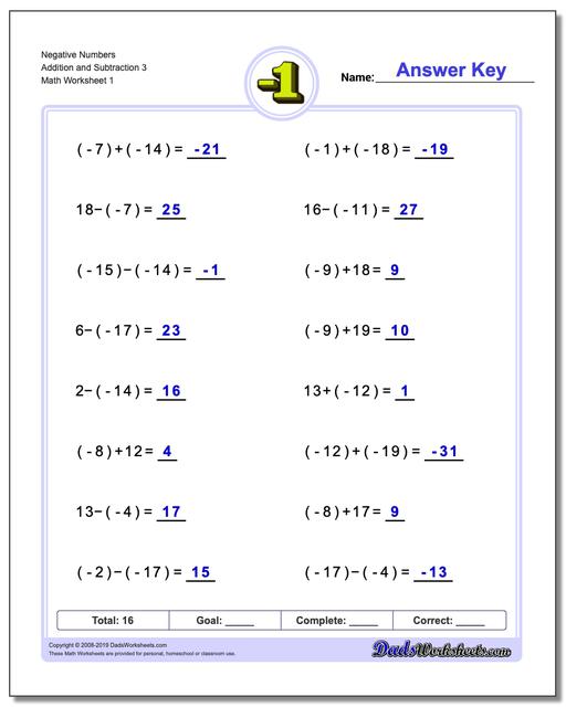 Adding Negative Integers Worksheets